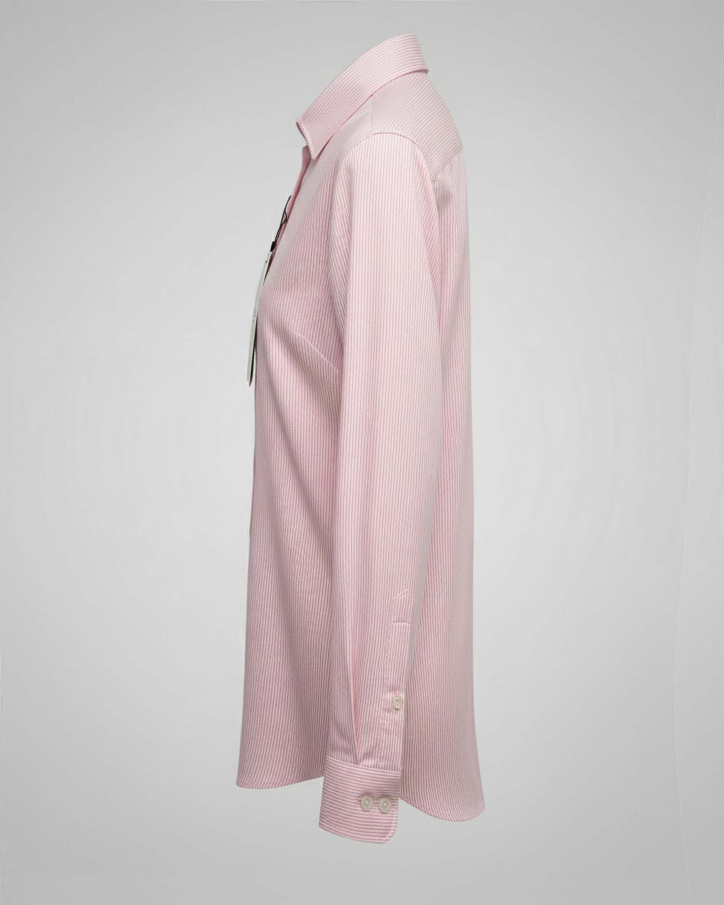 Elevating the ordinary white shirt, this chic cotton addition is woven with subtle pink dobby spots. Enjoy a flattering shaped shirt that is closely cut at the bust and gently expands at the waist and hip. The elegant pointed collar and fuss-free cuffs look flawless paired with jeans or tailored trousers.